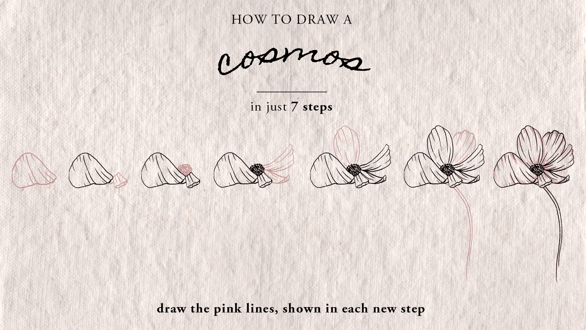 In this video i'll guide you in real time through the steps to draw a Cosmos flower, with descriptive audio instructions as well as on screen visual steps. The flower is broken down in to easy to draw steps, which are shown on screen throughout. Simply draw the pink lines shown in each step, to piece together your own floral masterpiece! My techniques make learning to draw, fun, relaxing and accessible to all, without any technical steps or prior knowledge needed.